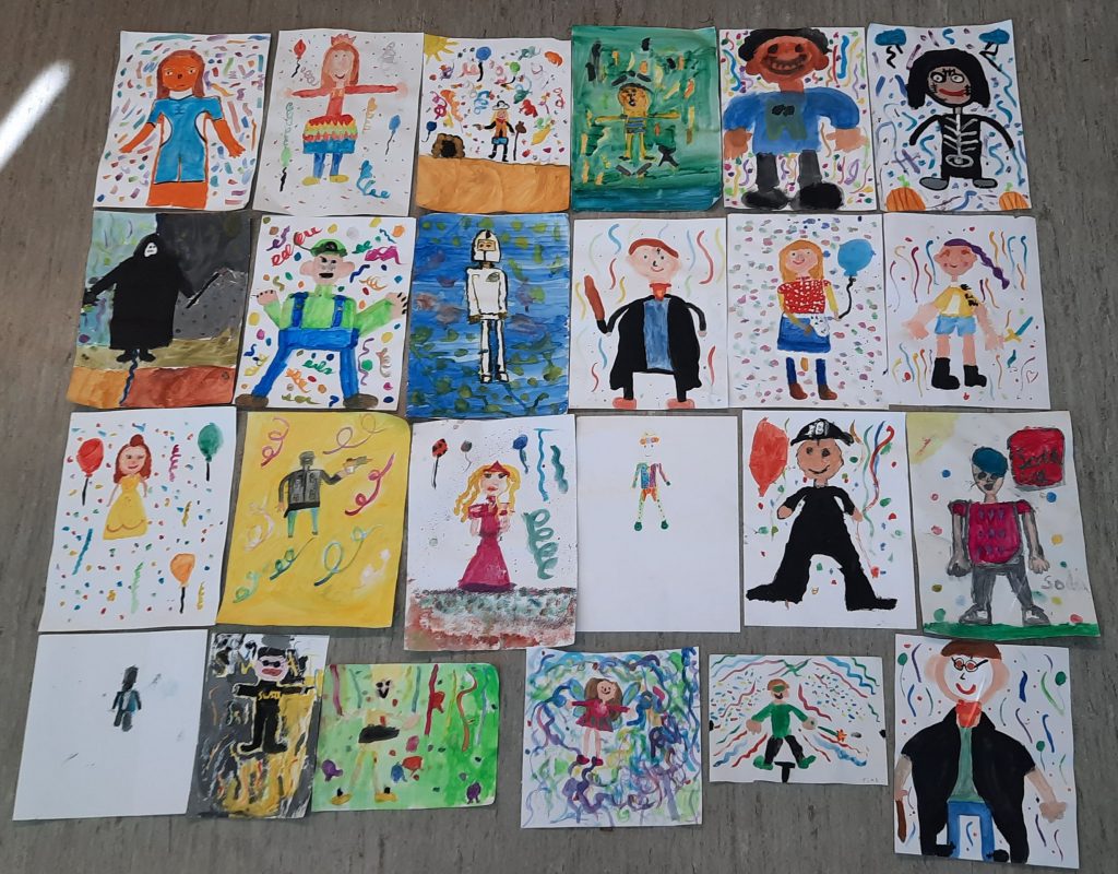 Nach den Ferien haben sich die Kinder der 3c nochmal an die gemeinsame Faschingsfeier und ihr Kostüm erinnert. Anschließend sind diese Selbstportraits im Faschingskostüm entstanden.