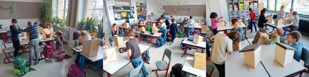 Weiterhin hat sich die 2c mit Zugvögeln und Standvögeln beschäftigt. Bald kommen die Zugvögel aus ihrem Winterquartier zurück und suchen wie auch die Standvögel geeignete Brutplätze. Wir wollen unsere einheimischen Vögel dabei unterstützen, indem jedes Kind der Klasse einen Nistkasten baut und zu Hause auf dem Balkon, im Garten oder auf der Streuobstwiese befestigt. Alle Kinder waren eifrig am Schleifen, Schrauben und Nageln und es hat nicht nur den Kindern riesigen Spaß bereitet! Ein Vater hatte sich die Mühe gemacht und für alle Kindereinen Bausatz hergestellt. Wir sagen ganz herzlichen Dank dafür!